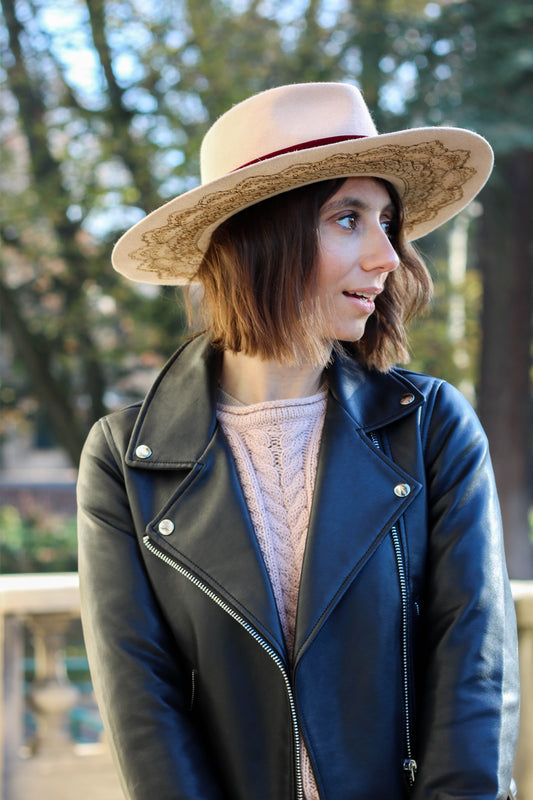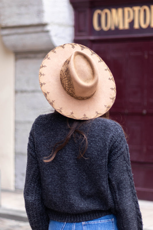 Les chapeaux de la collection Les Pyrogravés sont confectionnés à partir de feutre de poils, l'une des plus nobles qualités de feutre. Reconnu pour sa douceur inégalée, le feutre de poils offre un toucher luxueux et une durabilité exceptionnelle. Chaque pièce de cette collection incarne le mariage parfait entre l'artisanat traditionnel et la mode contemporaine, créant ainsi des chapeaux qui sont à la fois des œuvres d'art et des accessoires de mode élégants.